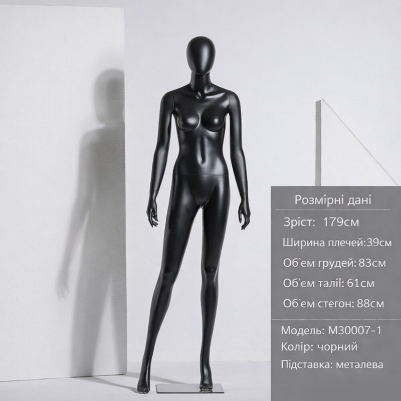 Елегантний жіночий манекен M30007-1 - ідеальне рішення для стильної та професійної презентації одягу у бутіках, шоурумах та торгових залах. Модель виконана із міцного пластику, має реалістичні пропорції та сучасний мінімалістичний дизайн в універсальному чорному кольорі. Гладка матова поверхня надає манекену преміального вигляду і робить акцент на одязі, що демонструється.