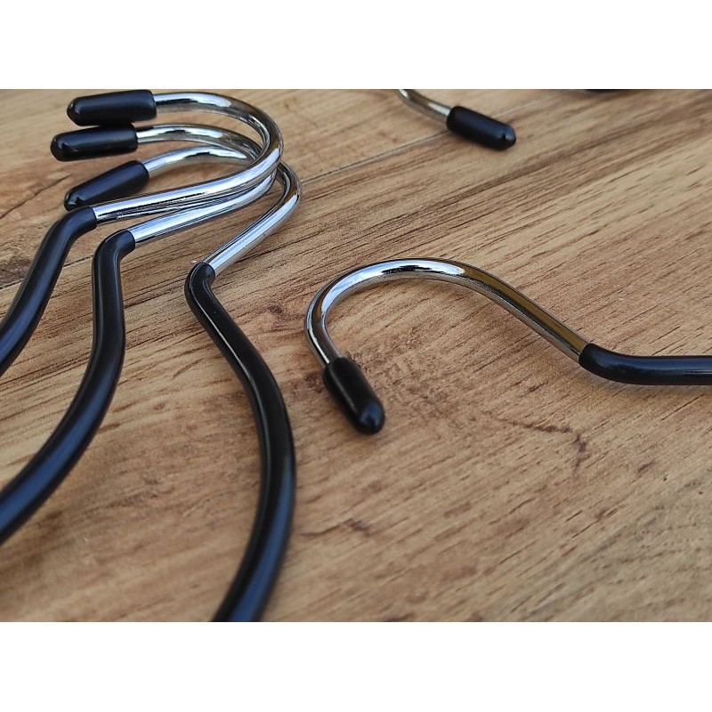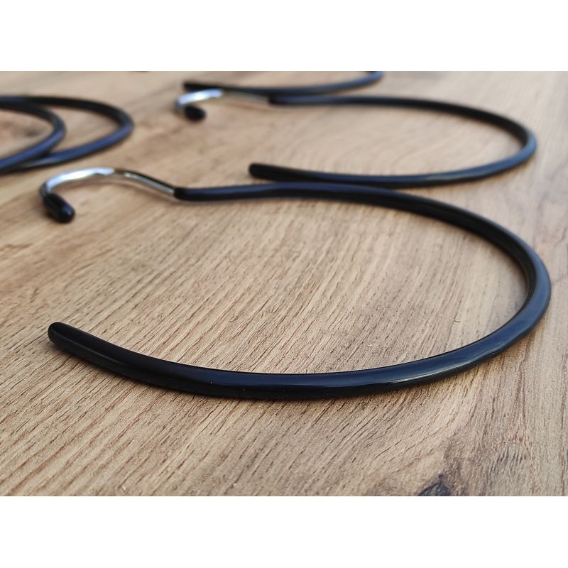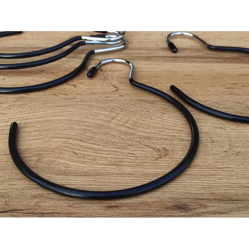 Металева вішалка-плечики з чорним,силіконовим покриттям Використовується для для продажу сезонних аксусуарів, шарфа, хусток, краваток. Це надійна вішалка виготовлена з металевого прута, покрита хромом і задекорована силіконовою поверхнею а також має захистний ковпачок у верхній зачіпній зоні.