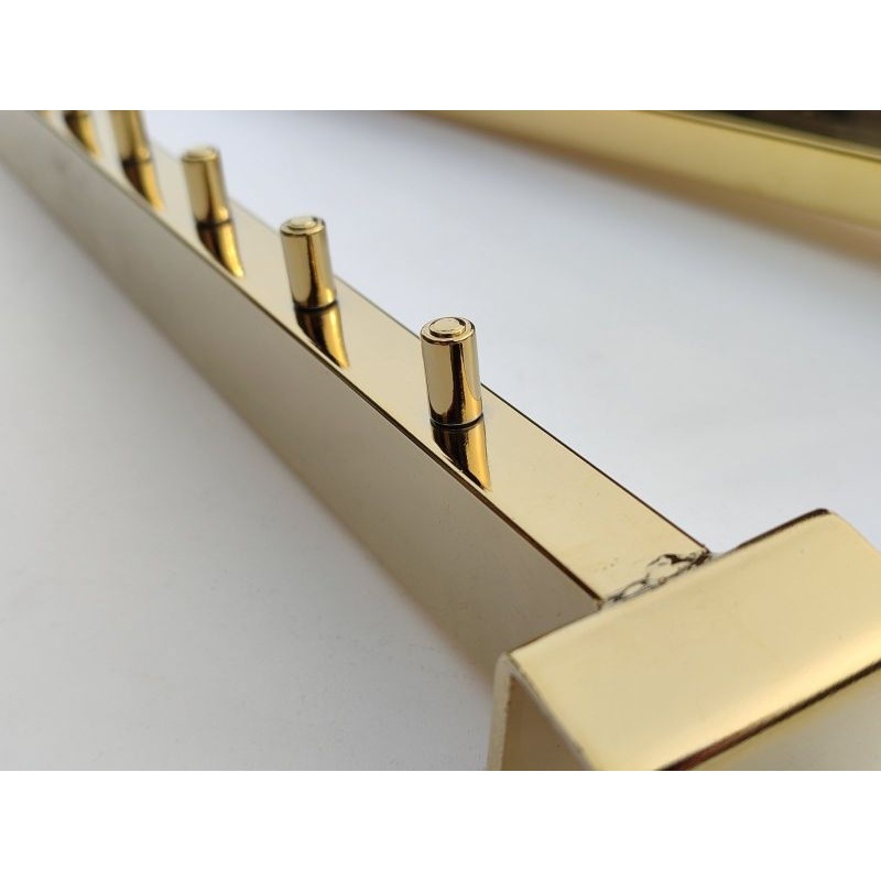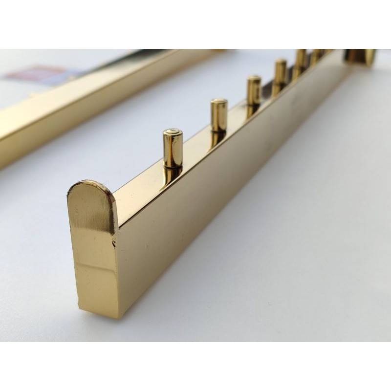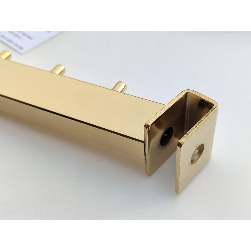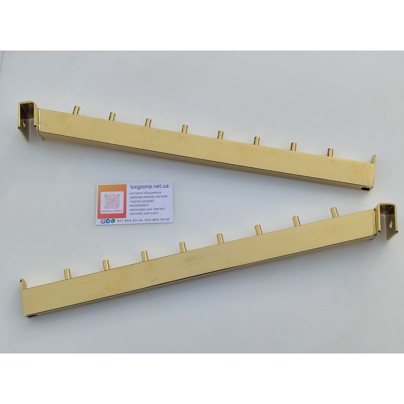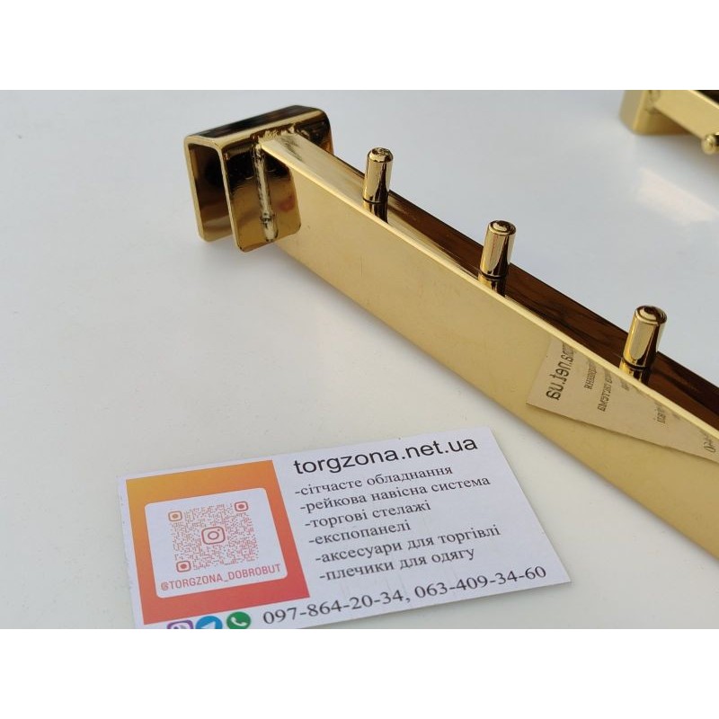 Кронштейн виготовлений із міцної профільної труби 15×30 мм, що забезпечує стійкість до навантаження та збереження геометрії при інтенсивній експлуатації. Похила конструкція покращує огляд товару та робить викладку більш динамічною та візуально привабливою. Золоте покриття надає обладнанню преміального вигляду і гармонійно поєднується з елементами золотої торгової системи.