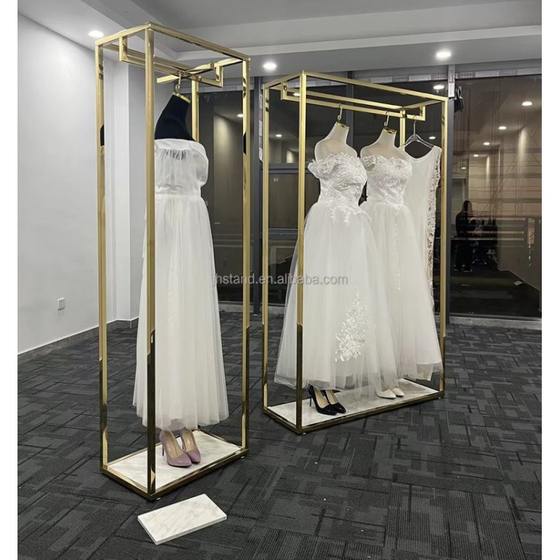 Стійка для весільних і вечірніх суконь 600×400×2200 мм у глянцевому золоті — преміальне торгове обладнання для весільних салонів, бутиків і шоурумів, де важлива ідеальна презентація виробу. Висота 2200 мм створює ефект “галереї”: сукні виглядають розкішно, не торкаються підлоги та красиво розкривають силует, а золотий глянець підсилює відчуття luxury і привертає увагу у вітрині та залі.