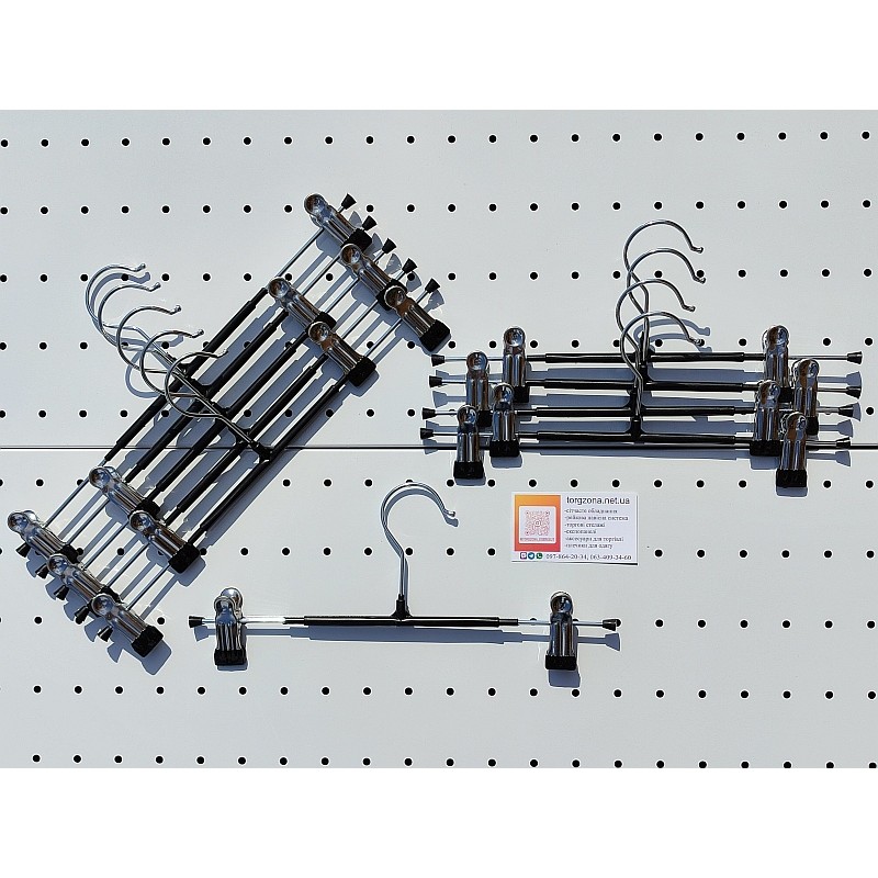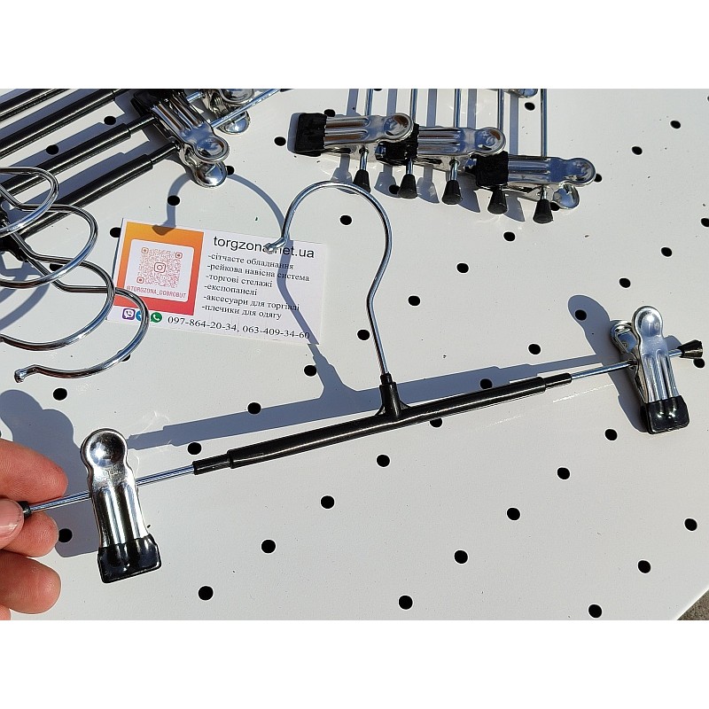 Металева вішалка з прищіпками — зручне рішення для акуратної демонстрації штанів, спідниць, шортів та аксесуарів у магазині одягу, шоурумі або бутику. Завдяки надійним затискачам виріб добре фіксується та не зісковзує, що дозволяє створити охайну і привабливу викладку товару.