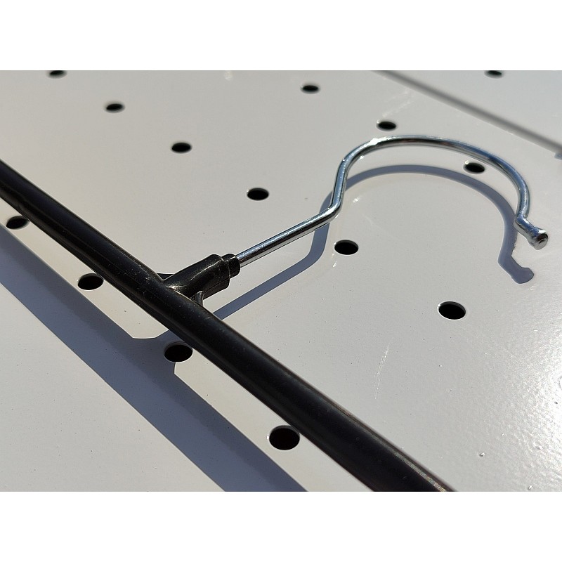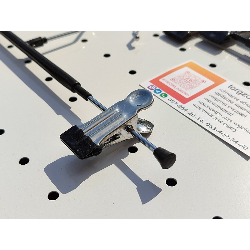 Вішалка виготовлена з металевого прута діаметром 4 мм, що гарантує міцність і довгий термін служби. Конструкція з двома затискачами забезпечує надійну фіксацію одягу та зручну демонстрацію товару. Металеве покриття стійке до зносу та підходить для щоденного комерційного використання.